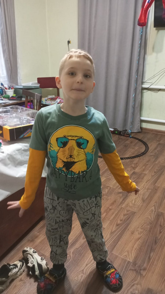 Ткань очень тонкая, горловина широкая и хлипкая. Взяла только потому что сыну очень понравился принт.. После первой стирки на бережном режиме распустились нитки на горловине и рукаве. Не поддерживаю положительных отзывов!!!